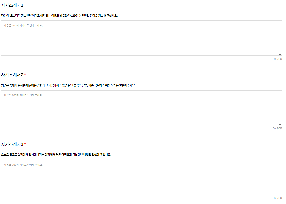 총 3가지를 작성하면 되는데 모두 700자나 600자 이내로 기술을 하면 됩니다.