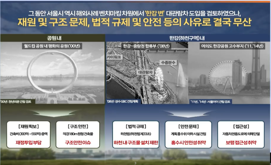 서울시는 해외의 다른 곳 처럼 대관람차를 수차례 도입 시도했지만 안전, 재정, 법적규제등의 이유로 무산되었습니다.
