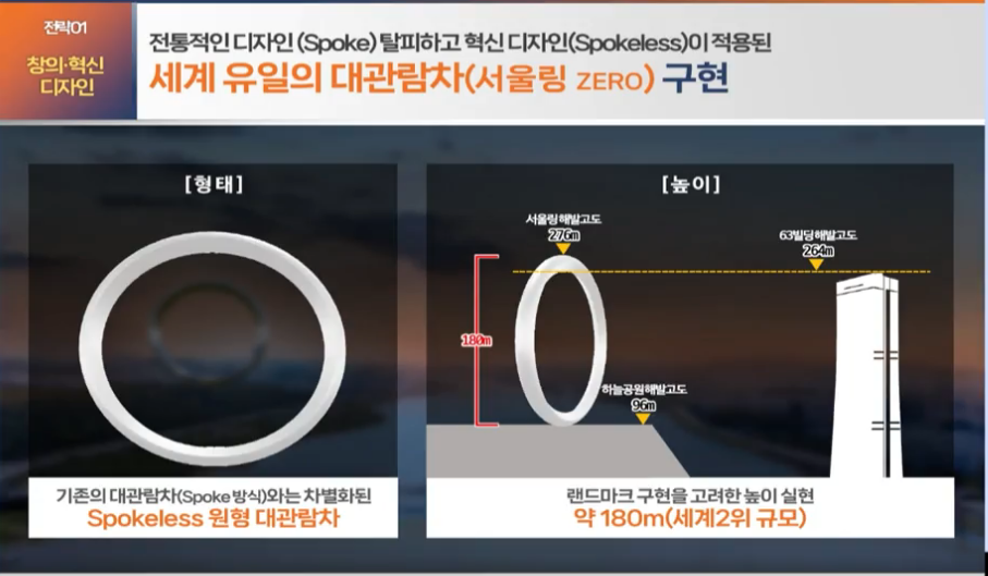 링의 형태로 생긴 Spokeless 원형 대관람차입니다. 높이는 180m나 되서 엄청날것으로 예상됩니다. 하늘공원 해발고도와 합치면 63빌딩보다 높습니다.