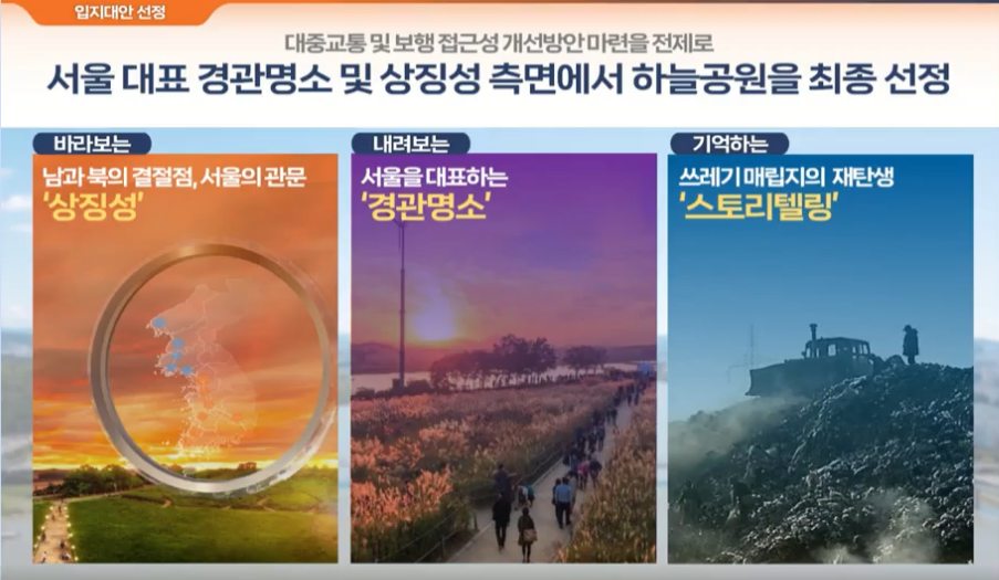 1. 남과북의 결절점이자 서울의 관문인 상징성, 2. 서울을 대표하는 경관명소, 3.스토리텔링이 가능한