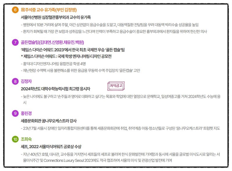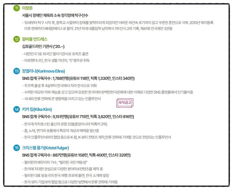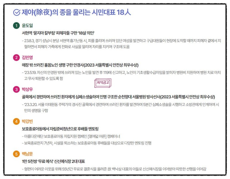 제야의 종 타종식은 새해의 시작을 알리는 상징적인 이벤트로, 올해는 시민 대표 12명을 포함한 총 22명이 종을 울릴 예정입니다. 여기에는 윤도일 씨와 김민영 씨와 같이 공로가 있는 시민들이 포함되어 있습니다. 이들은 과거의 위기 상황에서 용기 있는 행동으로 주목받은 인물들입니다. 그 중 주목 받는 사람은 우즈베키스탄에서 2002년에 귀화한 장엘리나입니다. 그녀는 틱톡커로 유명한 인플루언서 입니다. 그 밖에 참여자는 아래를 확인 부탁드립니다. 많은 인플루언서들이 참가 하는 것이 특징입니다.