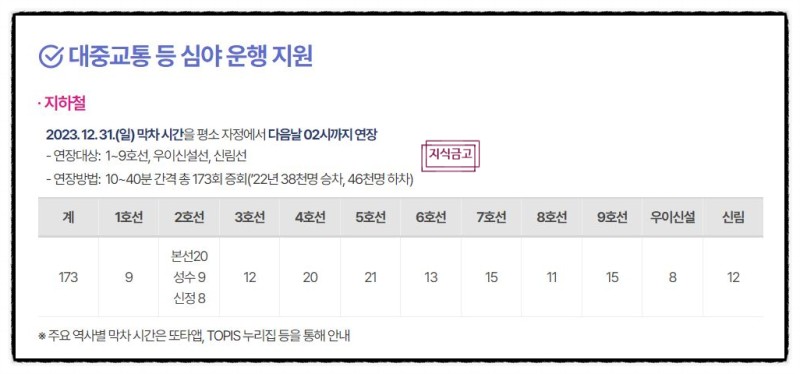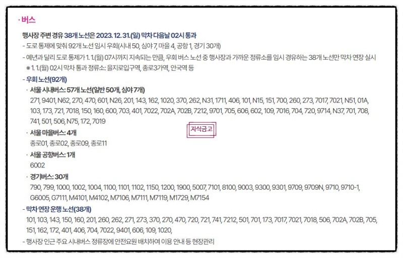 행사에 참여하실 분들은 대중교통을 이용하시는 것이 좋습니다. 차량 통행이 제한되기 때문에 도로 상황이 혼잡할 수 있습니다. 또한, 막차 시간이 연장될 예정이므로 대중교통 이용 시간을 미리 확인하시는 것이 좋습니다. 그리고 1호선 종각역은 무정차 통과한다고 합니다.