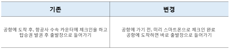 모바일 체크인을 이용하면 그런 과정이 필요 없습니다. 공항에 가기 전에 미리 스마트폰으로 체크인을 완료하고, 공항에 도착하면 바로 출발장으로 들어갈 수 있습니다.