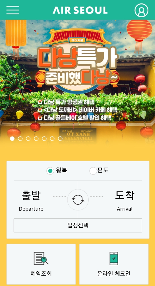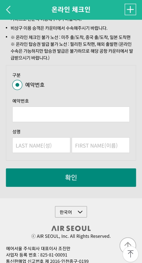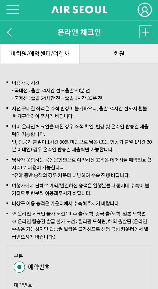 1. 에어서울 웹사이트 또는 앱에 '온라인 체크인' 옵션을 클릭합니다.