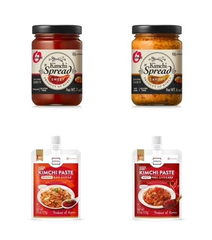 오푸드의 '김치 스프레드'는 샌드위치, 햄버거, 비스킷 등에 발라먹는 잼 형태의 제품입니다. 전통 김치의 매콤함에 달콤함을 더한 '달콤한 맛'과 올리브유, 아몬드, 땅콩이 더해진 '고소한 맛' 두 가지로 구성되어 있습니다.