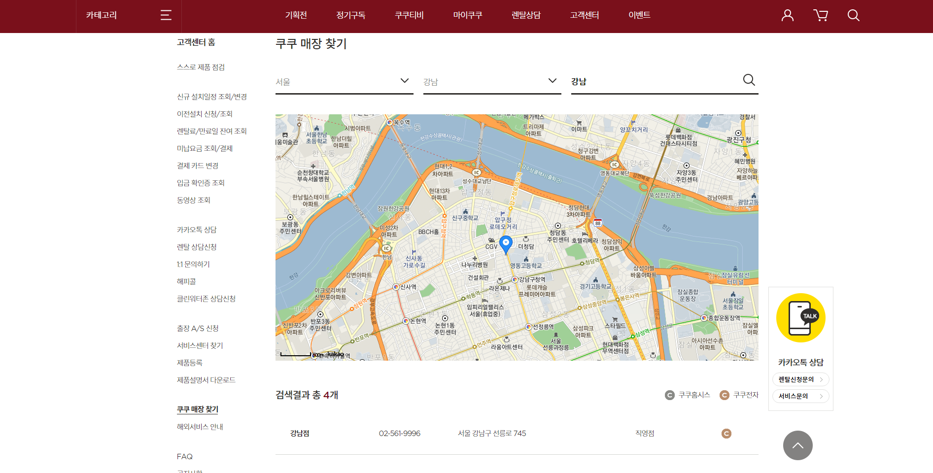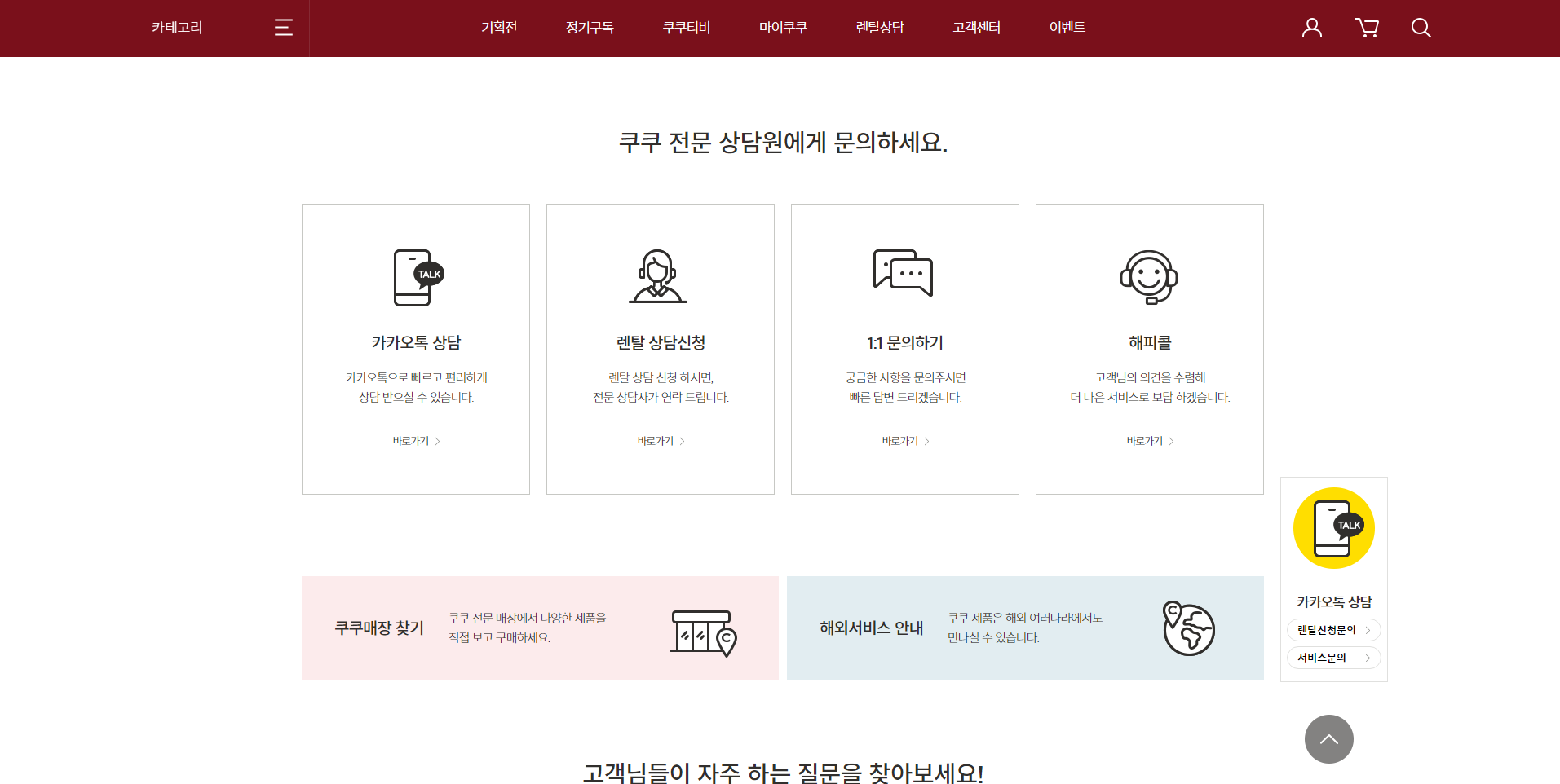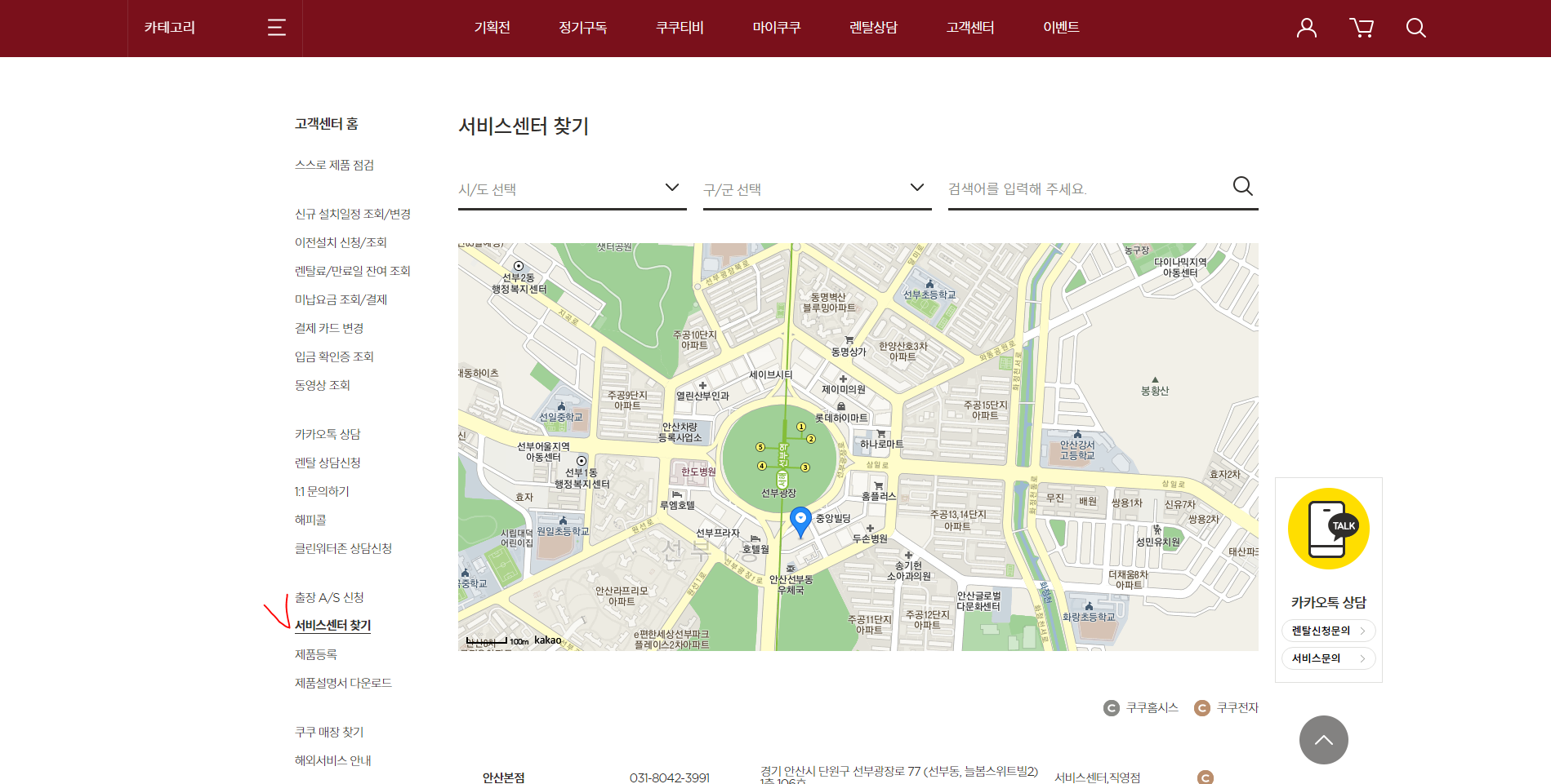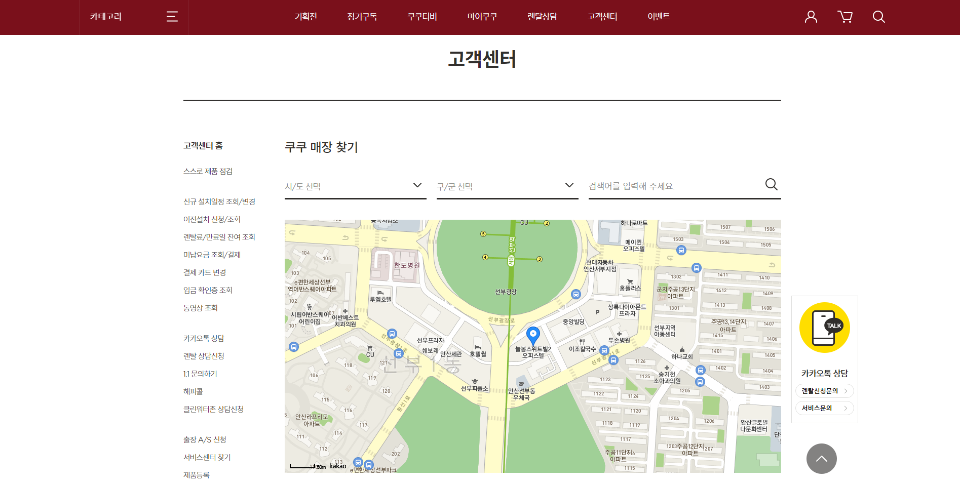 쿠쿠서비스센터를 찾으시라면 서비스센터 찾기를 누르셔야합니다.