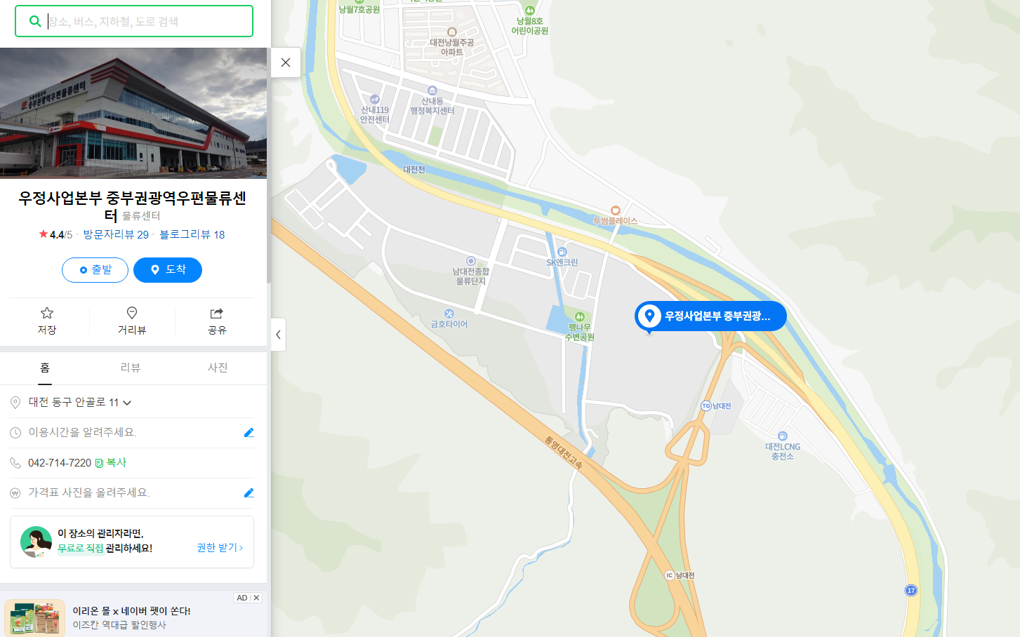 중부권광역우편물류센터를 찾아가려면 대중교통이나 자가용을 이용하실 수 있습니다: