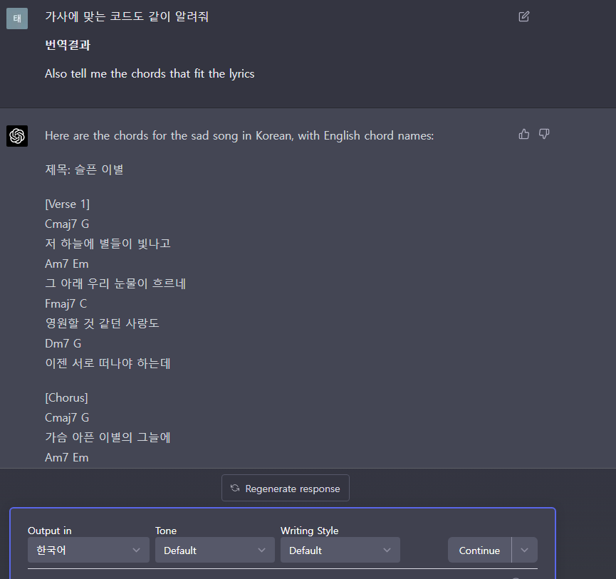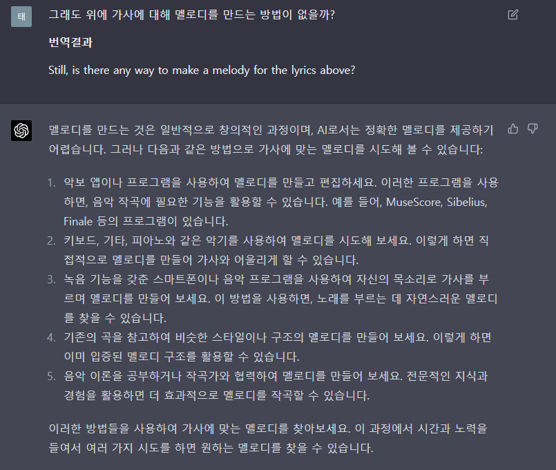 질문을 더 디테일하게 하면 더 잘 작곡을 해주기도 합니다. 예를들어 특정 단어를 넣어서 해달라던지 아니면 어떤 감성으로 작성을 해달라고 하면 그대로 해줍니다.