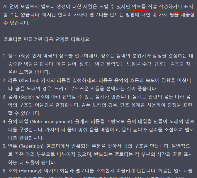 이런 멜로디는 작성을 할 수 없나 봅니다. 조금 아쉽네요. 멜로디는 현재 나와있는 다른 AI를 이용해서도 만들수 있으니 너무 걱정하지는 마세요