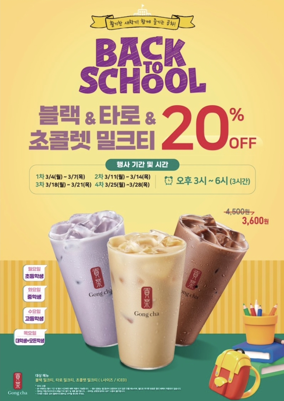 봄의 시작과 함께 돌아온 학기를 맞이하여, 모든 이들에게 달콤한 선물을 준비했습니다. 바쁜 일상 속 작은 행복을 선사할 밀크티 할인 이벤트! 이번 행사는 3월 한 달간, 매주 월요일부터 목요일까지 오후 3시부터 6시까지, 블랙 밀크티, 타로 밀크티, 초콜렛 밀크티 L 사이즈를 20% 할인된 가격에 제공합니다. 새 학기를 맞이하여 친구들과의 만남이나 혼자만의 시간을 보낼 때, 달콤한 밀크티 한 잔으로 기분 전환을 해보세요.